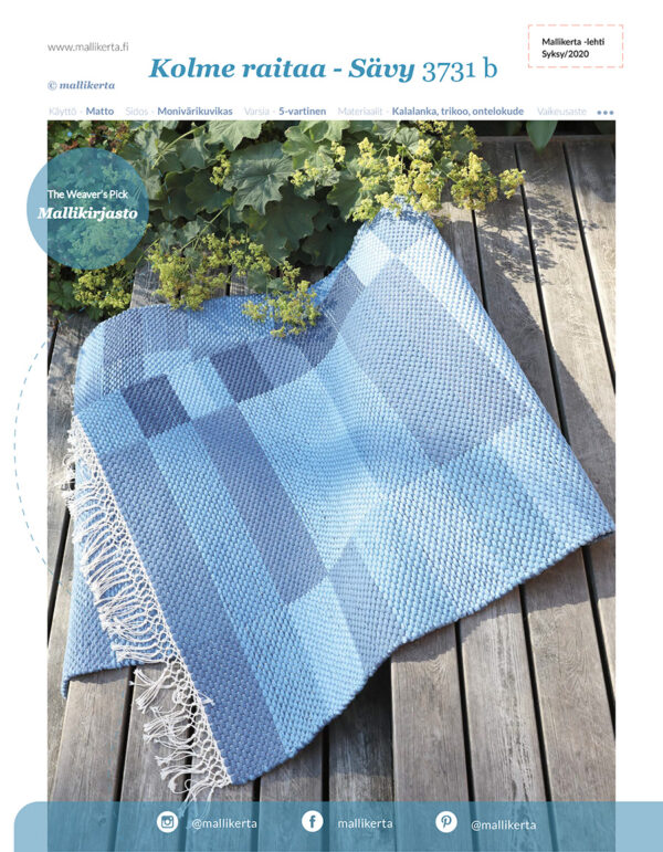 Samaan loimeen on kudottu neljä erilaista mattomallia: Kirsin räsykudematto 3731a, Sininen sävymatto 3731b, Lankamatto tupsuilla 3731c ja Matto kuteiden lopuista 3732d.