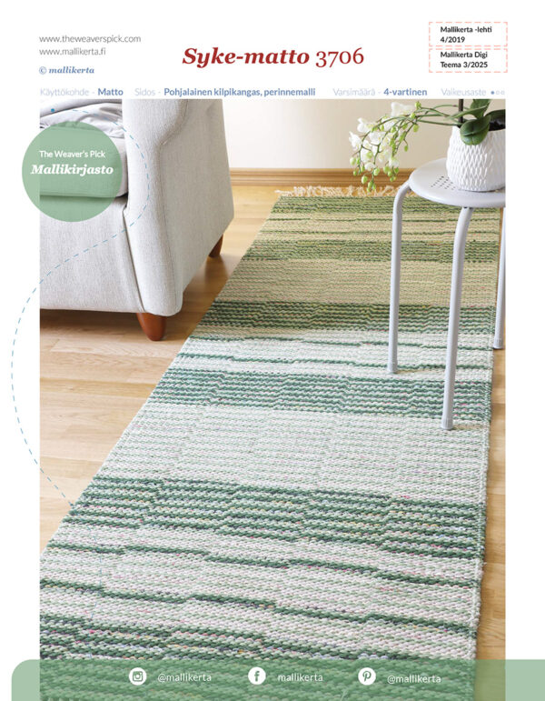 Perinteisen palkki-mallin raitaa on tässä matossa venytetty pitemmäksi. Pieni ”sykäys” rikkoo jokaisen väriraidan samasta kohtaa ja rikkoutunut raita luo illuusion matalammasta ja korkeammasta pitkittäisestä raidasta. Samaan loimeen on kudottu ruudullinen Tilkkumatto 3707. Malli on julkaistu Mallikerta-lehdessä 4/2019 ja Digi Teemanumerossa 3/2025.